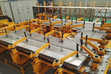 此工装用于组焊250公里动车3x端墙,采用了旋转轴丝杆压紧机构,两端在工装的重心位置设计长度可调式变位机接口,可以使工装在变位机上旋转和上下移动,使工人操作方便灵活。